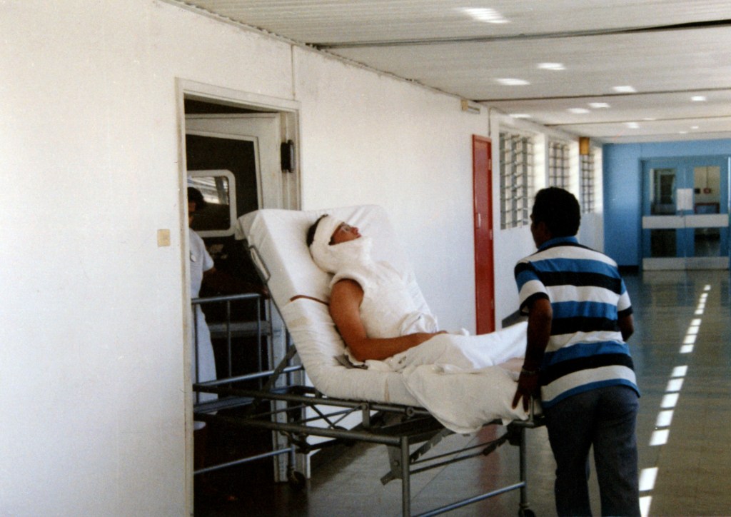 In spite of the fact that the train people had called ahead to the Fijian to have a doctor there when we arrived, there was none in sight nor none expected. At that point Katie used her travel agent credentials with the manager of the Fijian, and they finally located a doctor in the nearby town of Sigatoka. He came after about 45 minutes, looked at Dave, and said Dave probably just had a severe neck sprain and perhaps a concussion. However, he thought we probably should have him x-rayed in the nearest hospital with the appropriate equipment; this was in the city of Lautoka, about 100 kilometers away. The problem was to find an ambulance. This took another 30 minutes or so, and then it only took us to Sigatoka. After some more conversation — and time — they agreed to take him to Lautoka, so Pete went off to the hospital in the ambulance with Dave, and Katie and I went back to the Crow’s Nest, checked out, and moved all of our stuff to the Mocambo Hotel in Nadi, a city where the international airport is located and closer to Lautoka. We finally made it to the hospital about 9 at night or so, where Pete gave us the bad news. Dave did indeed have a severely broken neck.