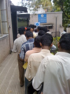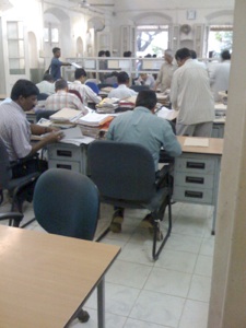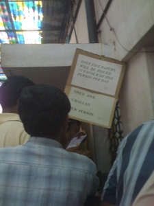 - Get stamp paper (Rs.20 denomination). What is stamp paper? It is special blank paper, issued by the government, with a colorful heading. This can be obtained only at State Bank of Mysore, which is not far but not close to the FRO. Wait in line, outside the bank. Expect to spend 1-2 hours waiting in this line (hope that it does not rain). As you get close to the head of the line, holding your “challan” (a slip of paper on which you have written your request for stamp paper), everyone in line is clearly excited that their wait may be over. People push more tightly. Push your challan and money through the first bank window, and then hang out with the other men (they are all men) waiting for their stamp paper. Wait some more. Hope that the man behind the second window will say your name loudly and clearly. Watch 25 men all crowded around the window, so that nobody can reach their paper when it comes out… but everyone is nice and hands the paper back through the crowd to the person named on the paper.