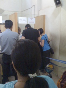 - Go back around to the first entrance, push through line #2, and look for the teller-like window at the far right (Counter #1). Wait in line. Wait for the attendant to stop fiddling with his mobile phone. Tell the kids to stop pushing each other and not to knock over the lady in line behind them. Give him your papers.