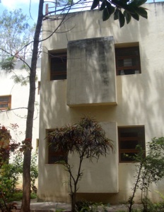 September, traditionally the wettest month of the year in Bangalore (over 200cm average), has just begun, and I’m concerned. I just met with the director of housing at IISc, showing him how the rain has seeped into each of our three closets, dampening our clothes and the paperwork we store. The photo below shows how the closets stick out from the main building; since they have their own (flat) roof they catch rain and it seeps inside. Mildew is clearly visible on the outside the top closet, which happens to be the one for the kids’ room.