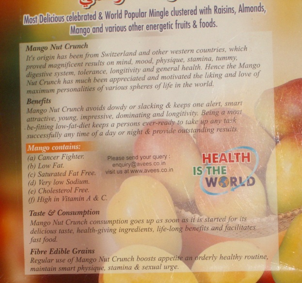 The limited English ability of many Indians shows on the English written on many products. I find this odd, considering that Indian manufacturers could surely find someone with strong English skills to proofread their labels. I found this cereal box especially amusing, partly for its “Inglish” and partly for the sentiments it tries to communicate. “…avoids dowdy or slacking & keeps one alert, attractive, young, impressive, dominating, and longevity. … maintain smart physique, stamina & sexual urge.” You don’t see health claims quite this explicit on US cereal boxes!