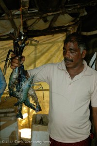 We motored out across the lake and along several canals, before anchoring for the night. The kids were thrilled that “Captain Babu” let them steer! The food was classic Kerala cuisine; for lunch we had a tasty curry, deep-fried blackfish, and 5 different cold salads, many based on coconut. We stopped in the afternoon to purchase fresh lake prawns (Rs1500) – the largest I’ve ever seen, each the size of a small lobster!