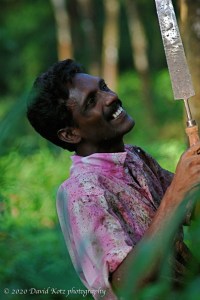 Kerala is a narrow state, wedged between the Arabian Sea and the mountain range of the Western Ghats. This mountain range is the spine of India, stretching from Mumbai in the north all the way to Kanyakumari at the southern tip (see part 1). On the plane trip from Bangalore, we followed this range southward toward Thiruvananthapuram, and I was struck by its rugged beauty and by how remote and untouched they seem to be in many places. In this region, these hills reach at least 5000’, with some peaks above 8000′, and I was amazed to see some areas above treeline, with only grasses growing at their summits. The roads were incredibly twisted and narrow, and it took several hours for us to wind up past the coconut plantations, through the rubber plantations, and over the hilltop tea plantations. At right is a photo of a rubber-tree worker, and of the boys wandering through tea fields at the top of the Ghats.