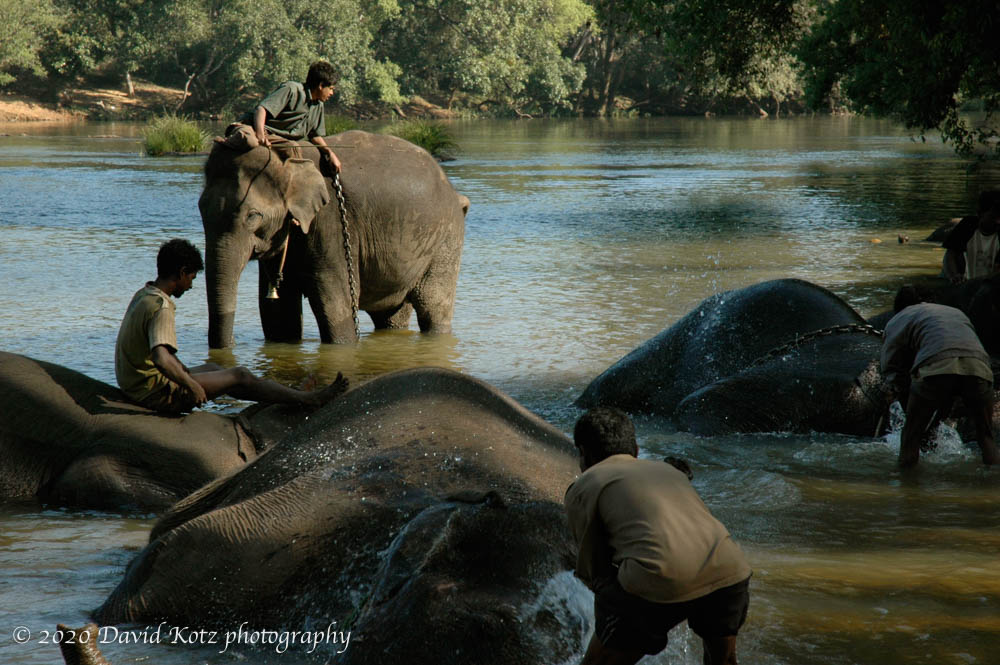 Our visit was mostly a time of relaxation, but one morning my father and I went out for a birdwatching walk before breakfast – I took many photos but only a few came out well due to the low light. We also took an excursion to visit Dubare elephant camp, a state-run reserve where they care for elephants that have been captured from the wild. We could not walk on the forest trails, because the forest department was currently hunting several wild elephants that had been destroying villages and killing people; once they capture them, they bring them to live at Dubare. The kids gave some elephants a bath, and we watched while workers fed the elephants.