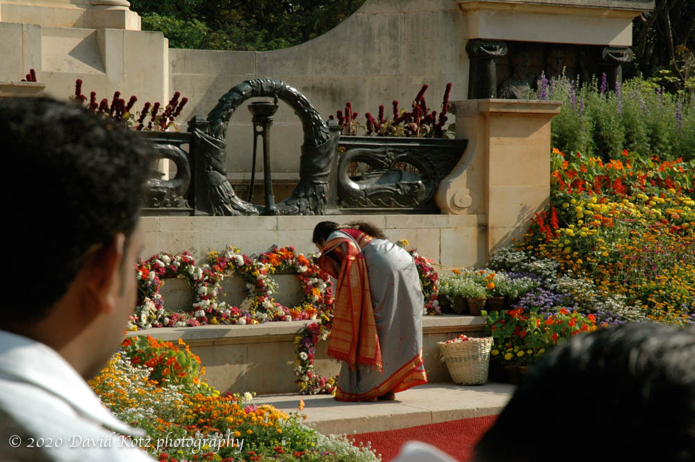 Then, the people attending – faculty, department heads, employees of all types – approached the foot of the statue. Most sprinkled flower petals and briefly paid their respects – with palms together, or fingertips to forehead, like you might seen a temple. A few kneeled or even prostrated themselves before the statue. I certainly had the impression that the people of IISc revere Tata and are deeply thankful for his beneficence (and foresight) in founding this organization.