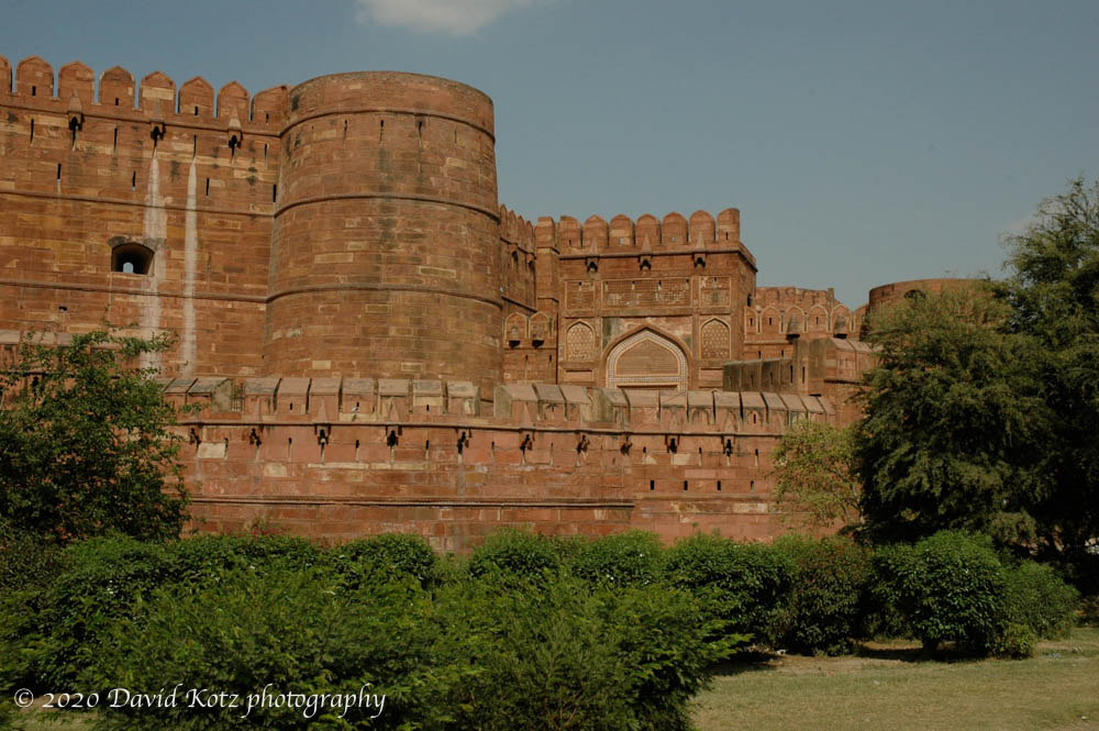 The Agra Fort was for quite some time the capital of the Mughal empire in India, before Shah Jahan built the Red Fort in Delhi and moved the capital there. It is an impressive defensive structure, with two moats (a dry moat for lions, tigers, and snakes and a wet moat for crocodiles), two walls, and an uphill ramp to the entrance to make it more difficult for elephants to ram the gates. Inside are extravagant palaces; it was here that Shah Jahan, who had built the Red Fort in Delhi and the Taj Mahal for his beloved wife, was imprisoned by his son Aurangzeb, who had killed all his brothers to take over the throne of the empire.