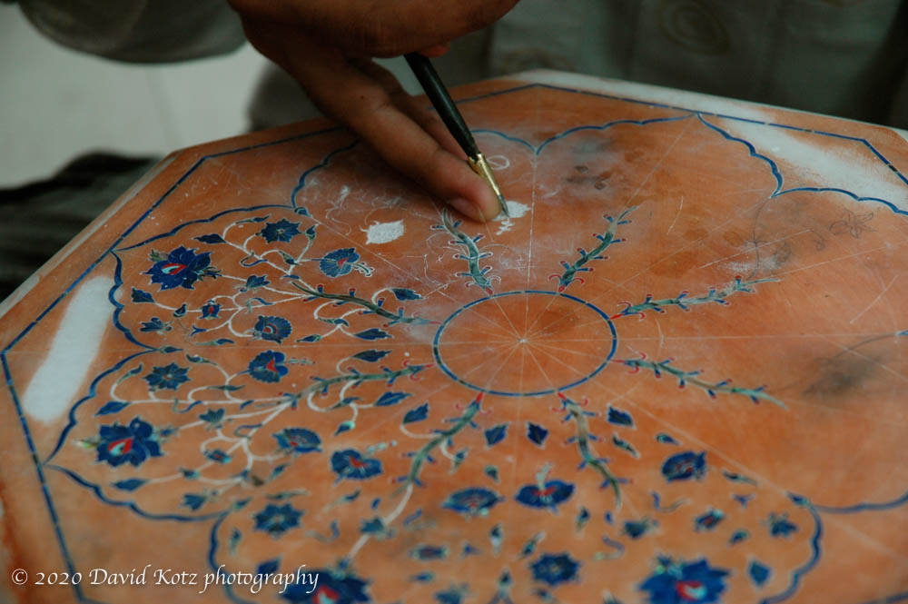The marble inlay work on the Taj Mahal was accomplished by thousands of craftsmen. Today few craftsmen exist, and the art may be dying. The Government provides free housing to those descendants of the Taj craftsmen who continue their trade. We enjoyed a visit to a local shop to see how it was done and purchased some small items.