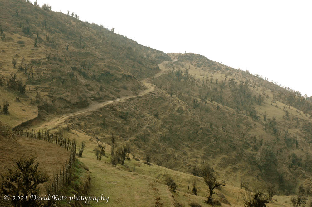 The border is visually striking in the stark difference between the natural environment of Singalila National Park on the east (India) side of the ridge, and the deforested, overgrazed grasslands on the west (Nepal) side of the ridge.