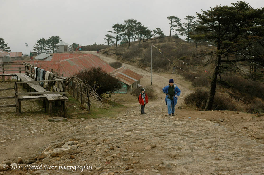 Before the trek the company head assured us that the cooks take great care with food preparation, even parboiling the fresh vegies used in a salad. At the first dinner, Pam and I broke our longstanding no-fresh-veggies rule and dug into the salad. Big mistake. Mid-morning the next day I was off in the bushes, exploding from both ends simultaneously. By evening, Pam was struck too. (For once, I am glad the kids did not eat the salad!) This day and the next involved our steep climbs, which I can attest are much slower when one needs to dash off to the woods with a trowel and TP every few switchbacks.