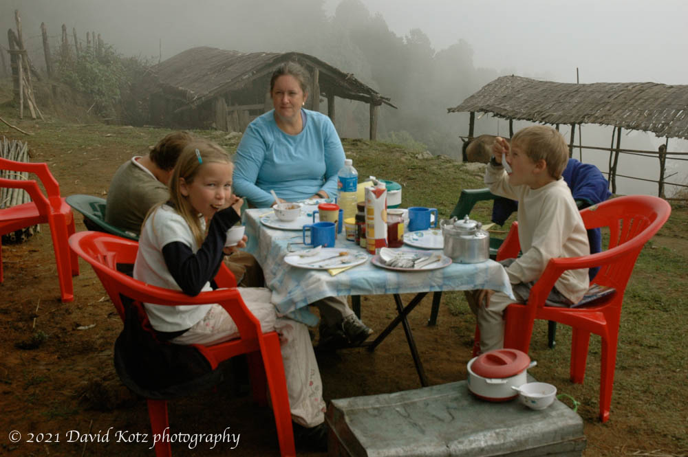 Wangchuck walked with us each day, carrying only a light backpack and an umbrella. The rest of the crew pack up camp, passing us mid-morning so they can provide a hot four-course lunch (with table cloth, plates, and silverware). They pass us again mid-afternoon so we arrive at a campsite all prepared. In late afternoon they bring hot tea and biscuits, and then bowls of warm wash water. A typical dinner is soup, rice, dal, two or three curries, chapattis, and a dessert like fried bananas; always far more than we can eat. Once they even managed pizza! After “bed tea” at 6am, breakfast would be served at 7am; typically, porridge, omelets, toast with jam or honey, tea or instant chocolate. Every day was different food.