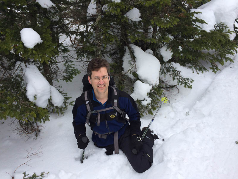The soft wet snow, four feet deep along the upper reaches of the trail, provided great opportunities for butt-sledding and made for a quick descent. Four hours up, less than two hours down. Great day!