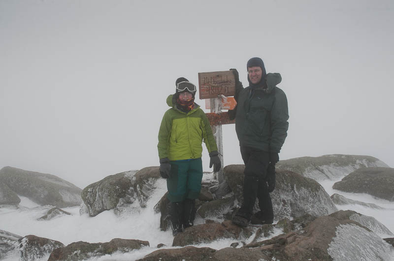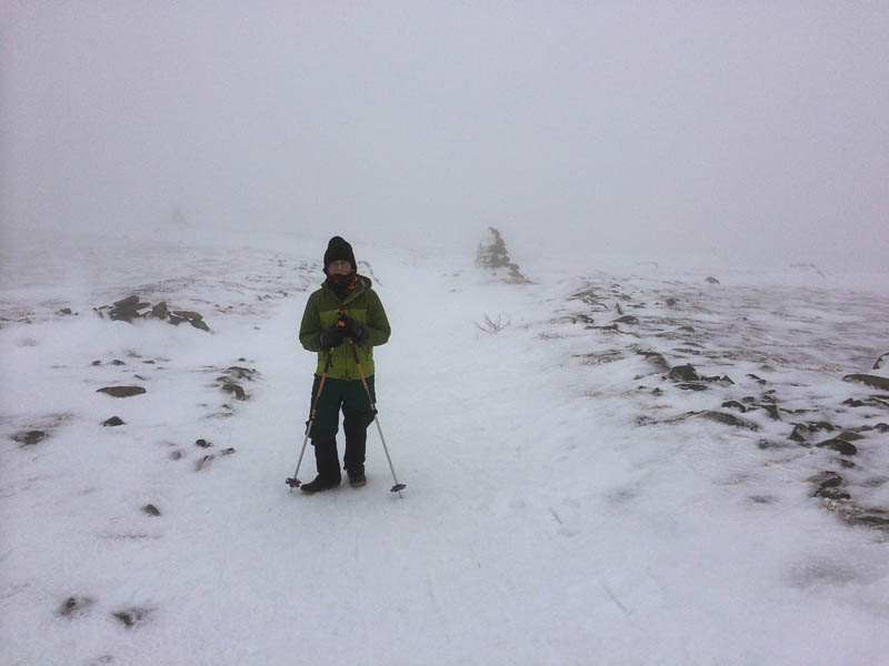 As we reached the Carriage Road trail junction and the ridgeline, we climbed into the clouds. The temperatures were still above freezing, though only barely, and as we crossed the ridge and climbed above treeline the wind picked up and the ambient temperature dropped. We could barely see from one cairn to the next, but Andy was so enthralled by the rime ice that we took our time. We met six backcountry skiers at the summit, and explored the cloudy terrain for a while before heading for home.