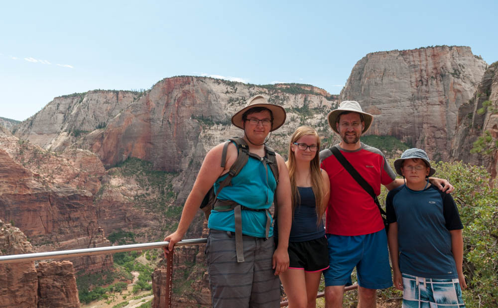 We only had one day to explore the park, so our first step was to hike to Angels’ Landing. This stunning peak juts out into Zion canyon, with views up and downriver, and with a knife-edge approach and thousand-foot exposure guaranteed to give even nimble-footed hikers second thoughts. (At least six hikers have fallen to their deaths from Angels’ Landing in the past decade.) Clearly, other visitors had heard about this classic hike, so the trail was busy and the summit area held several dozen people throughout the period we were there. (Thankfully, we reached it in mid-morning, before even-bigger crowds and before the hot afternoon sun.) The kids and I stopped for the photo below at the point where the trail narrowed to cross the knife edge; although Andy and I shuffled along further, gripping the safety chains at all times, I decided that it wasn’t worth the risk to proceed so we turned around. Some great views in the photo gallery.