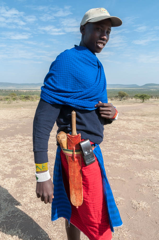 The waistbelt of a modern Maasai warrior/ranger includes a wooden club, a machete, and a cellphone. Enashiva reserve, Tanzania.