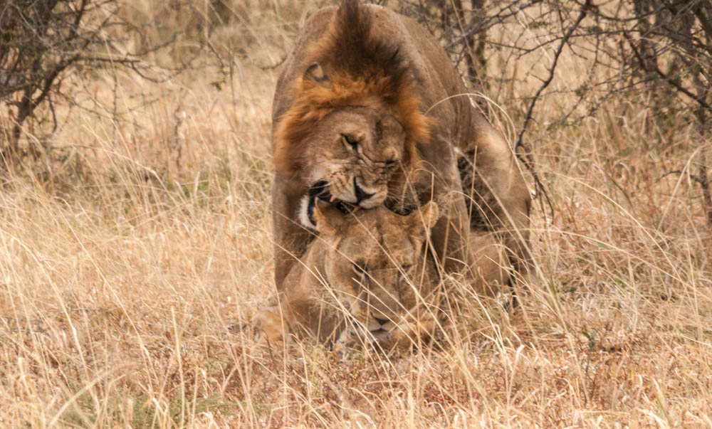 Another highlight was our first good view of lions. We came across a pair of lions close to the roadside, a male and female resting in the shade. Likely a mating pair, said Freddy. I didn’t quite expect his assessment to be quite so accurate, quite so graphically and so immediately. As we watched, the male got lazily up from his nap, stretched, and proceeded to mount the lioness. This dramatic moment lasted only a couple of minutes, before she made it clear it was time to stop. He lay down again to rest while she rolled onto her back. Perhaps 15 minutes later they repeated this activity. (See photos.)