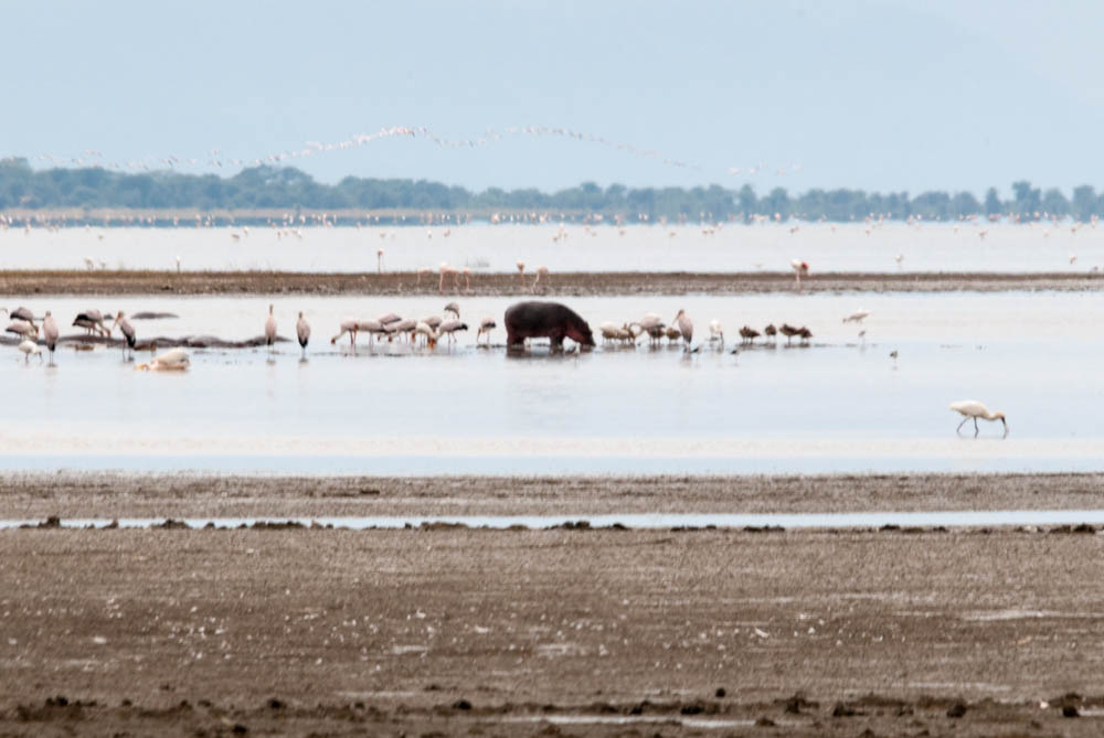 Lake Manyara National Park is an impressively large soda lake – that is, highly alkaline because it has no outlet; its waters slowly evaporate as the dry season progresses. Nonetheless it provides a rich ecosystem for the algae and tiny crustaceans that feed flamingo and dozens of other aquatic bird species. Along its west side are the steep slopes of the Great Rift (actually, Gregory Rift), verdant with springs that nourish the green forest and meadows along the west shore of the lake. As we drove from south to north between the rift wall and the lake, we encountered an impressive family of elephants. (We stopped to watch – not that we had any choice, with elephants standing in the road in front of us – but then, we wondered, what to do when more elephants park themselves in the road behind you?) Eventually the elephants stepped aside and we moved along. Soon after, a busy family of baboons grazed in the roadside vegetation. Scattered across the lakeside meadows were grazing zebra, giraffe, and wildebeest, including one unlucky zebra that now fed a pack of vultures. Near the geothermal hotsprings were rich fields of marsh grass and a satisfied-looking family of hippos; the park had built a nice pier out into the lake here to make it easier to explore the birdlife on foot. Far out into the shallow lake waded hundreds, nay thousands, of flamingoes, storks, gulls, and herons of all sorts. Impressive place — and to think we saw it in the dry season, when there are fewer animals present!