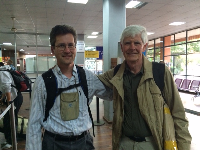John, Erin and I were met by a local Thomson guide. We first visited the Cultural Center gift shop for a bit more shopping, then had lunch at a pleasant outdoor restaurant, and finally stopped at the glitzy Mount Meru Hotel to use a couple of day rooms where we could clean up before the long trip home. As he drove us to the airport we stopped for a quick view of Mount Kilimanjaro, impressive even at this distance. At the airport I let John board a plane alone, as his route homeward took him through Nairobi and London whereas Erin and I were heading through Kigali and Amsterdam. I have to say, I was nervous to watch my first-born son board a plane with the expectation of changing planes in two distant foreign countries.