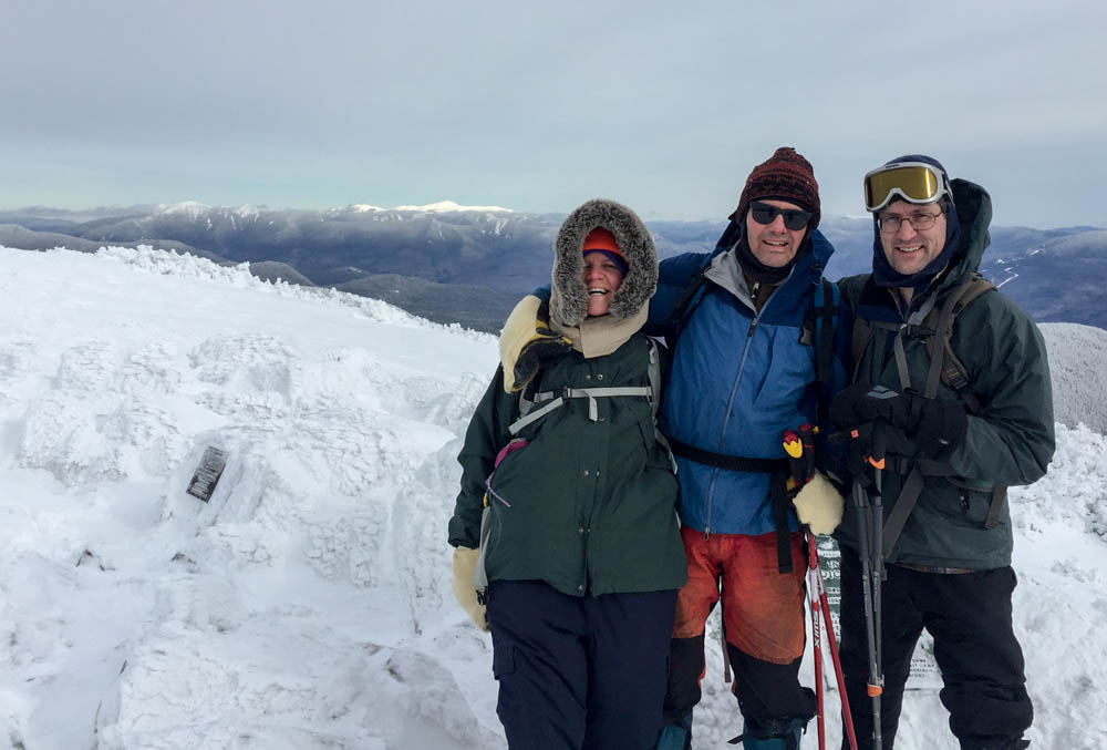We were the first to arrive at the Couching Lion parking area on the east side of the mountain, and planned an 8.4-mile loop (up the Dean Trail, along the Long Trail following the ridgeline, and down the Monroe Trail). We made first tracks through several inches of fresh powder on the Dean Trail and Long Trail, enjoying vast views of the Adirondacks and glimpses of Moosilauke and Washington in New Hampshire. We saw nobody else until we hit the summit cone, where we met two hikers and their chilly dog. On the way down, though, we encounters dozens of hikers who had come up Burrows or Monroe trail, and had an easy glide down that latter trail. Check out the photo gallery.