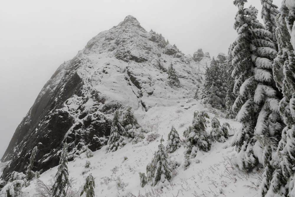 I followed old tracks, covered in this morning’s snow, around the base of the Haystack. The footsteps disappeared at the base of a steep gully, where tiny avalanches caused golf-balls of snow to roll down toward me. Gosh, this gully is steep, and extremely exposed. I picked a line and tentatively began to climb, but thought better of it after a dozen yards. I retreated and picked another line. Going upward was easy, kicking steps in the wet snowpack. About halfway up, though, I reconsidered the exposure. A slip here would mean a long slide down the gully, ricocheting off the boulders. Hiking solo, and with few other hikers visiting the Haystack today, I decided it’d be best left for another day.
