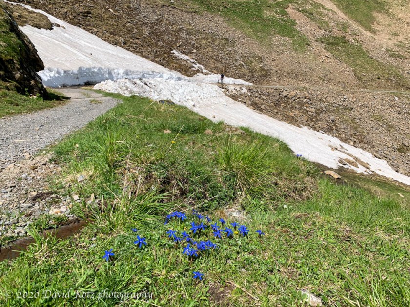 As I took my first steps up Ziger, the first of my gipfel, a jet plane zoomed past, doing a barrel roll just a hundred meters over my head. (The Swiss air force likes to spend sunny days in the mountains, too.) Passing other hikers, some much younger and some much older than me, I soon left the main ridgeline and cut across some ski slopes that had challenged (ok, frightened) me a few months ago, now blooming with wildflowers. At one point the trail cut through a snowbank, but the trail maintainers had plowed it clear.