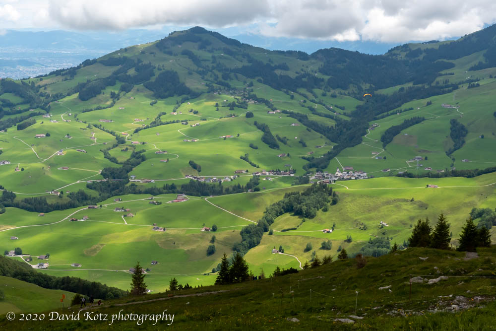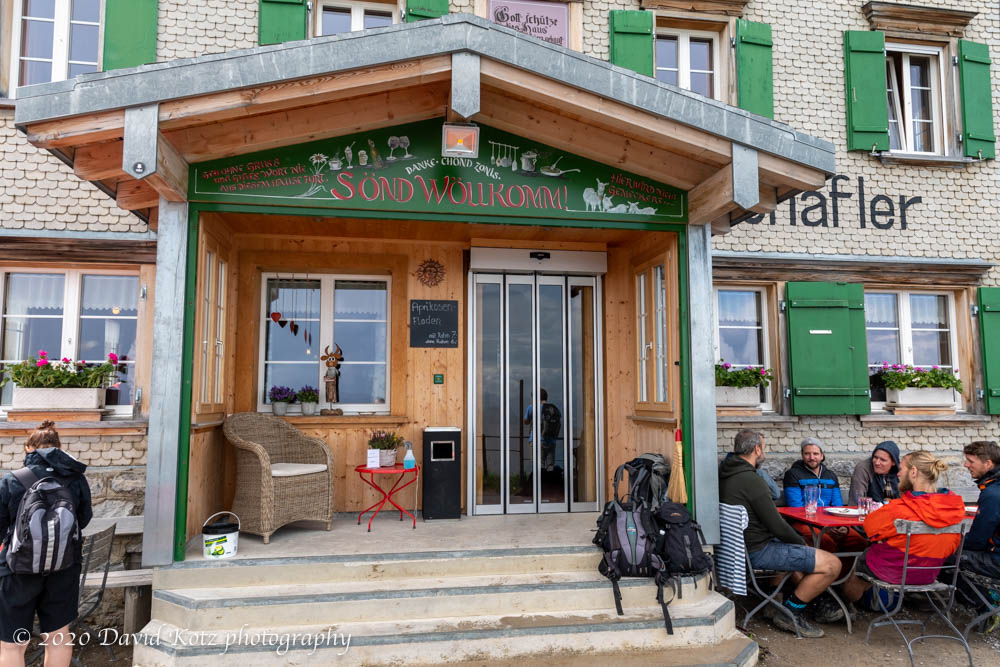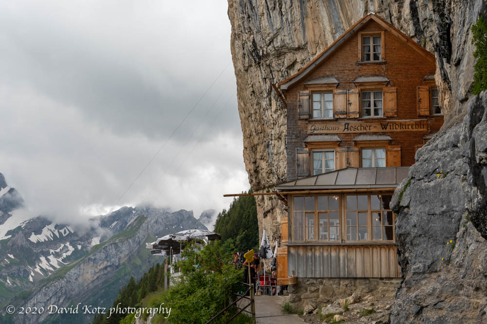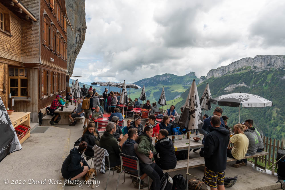 Although there were heavy, high clouds, the sun came and went throughout the afternoon, and the remaining clouds gave the landscape an etherial atmosphere. We enjoyed seeing dozens of paragliders soaring over the pastoral valley landscape, exploring the prehistoric caves and tiny Wildkirchli church on the trail down from Ebenalp to the famous Äsher guesthouse. We managed to immediately get a table on the veranda at Äsher.