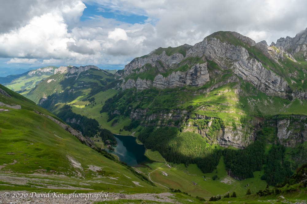 A view down-valley of Seealpsee and, opposite side, the route David would take the next day.