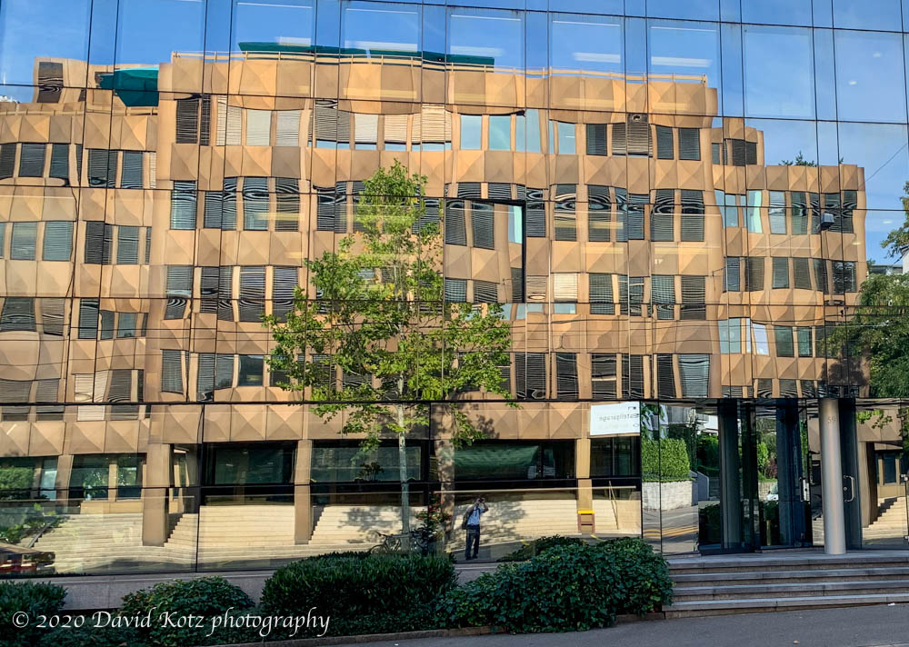 The CDHI offices (and me!) are reflected in the building across the street, August 2019.