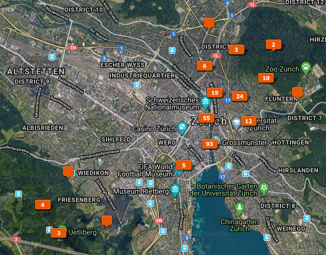 Here’s another pair of maps, showing the location of all the fountains (all my photos are geo-tagged). The numbers represent photos, not fountains, so they over-count fountains; also, photos that are close together are aggregated into a single bubble on the map. The first map covers all of Zürich; the second map zooms in to my home turf.
