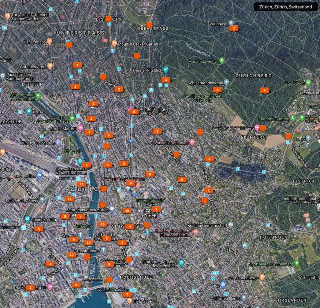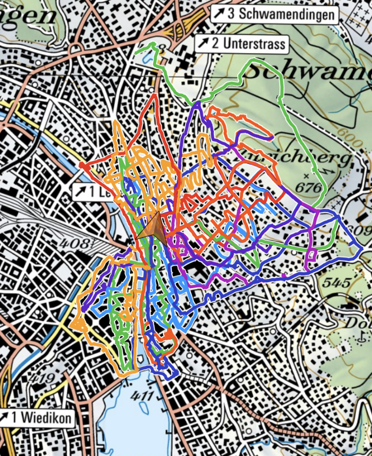 I managed to make a thorough coverage of the intersections in the hillside between Altstadt (by the lake) and Zurichberg (at top right).