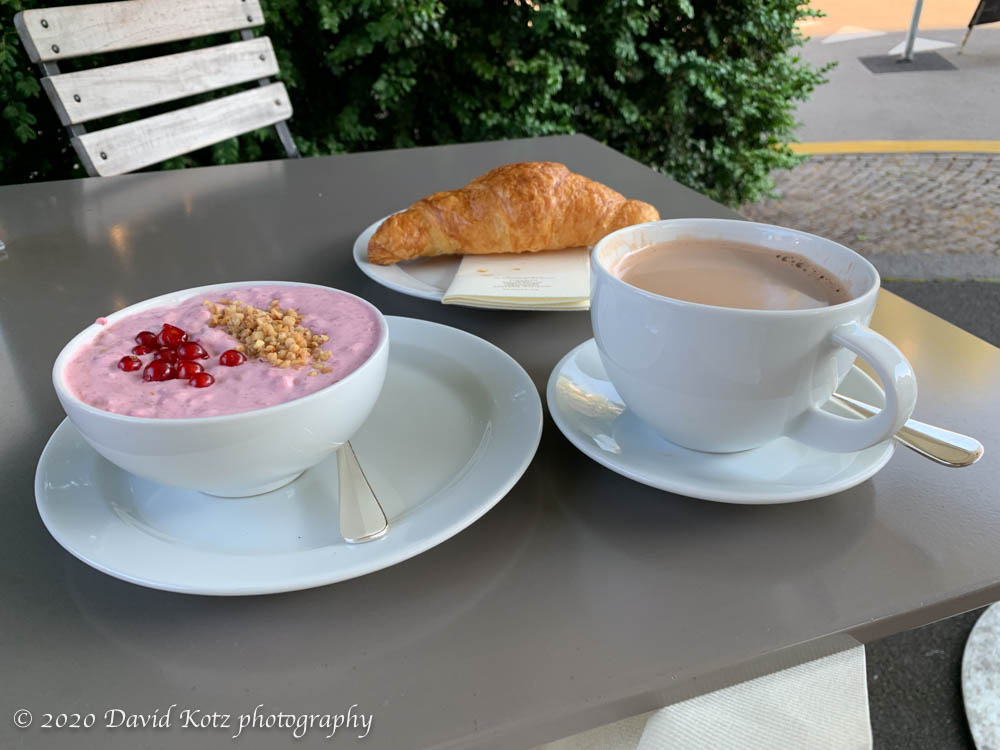 We were lucky to have rented a comfortable ETH flat, just a few blocks from the main train station (HB) and from my office (WEV), with a view over the lake Zürichsee to the Alps beyond. From here, I enjoyed a near-daily walk straight uphill to the Zürichberg ridgeline, which offered even better views, and an ample variety of routes down through tree-lined residential areas – where I would often stop for hot chocolate at a neighborhood Honold shop. This week I finally stopped long enough for a breakfast of my three favorite things: bircher muesli, gipfeli, and heisse schokolade.