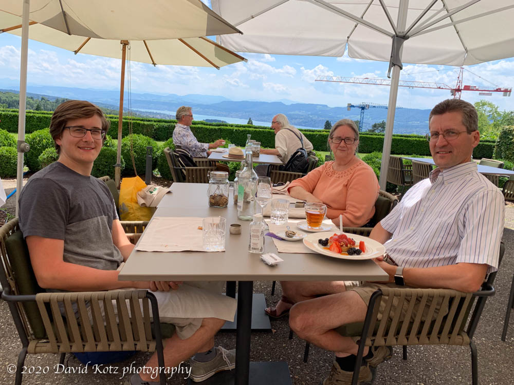 Andy, Pam, David go for birthday lunch at Zürichberg Hotel.