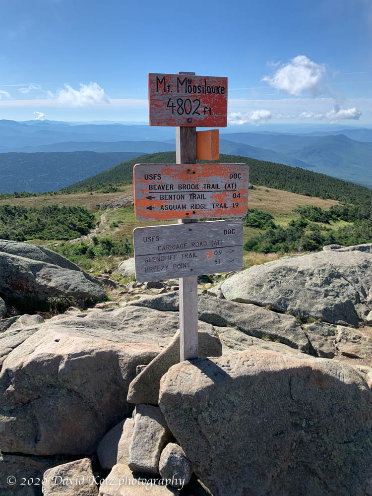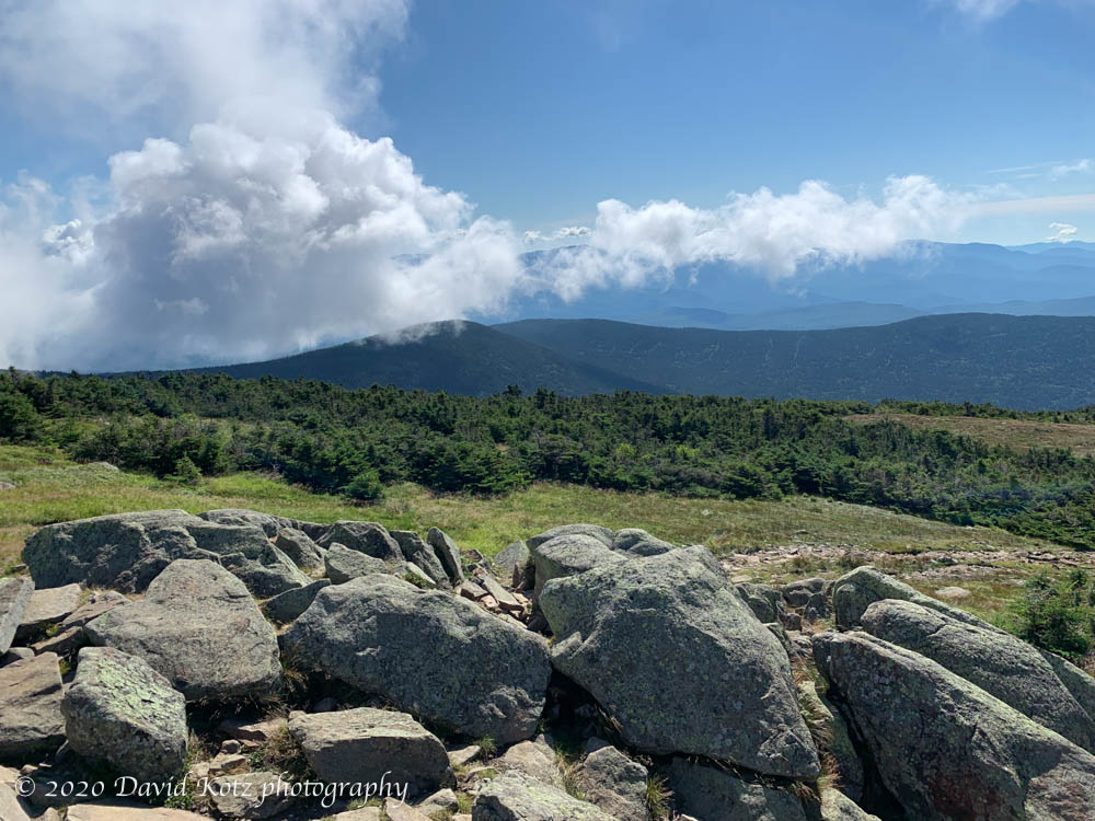 I arrived early and parked at the satellite parking area – the road is gated because Moosilauke Ravine Lodge is closed due to the pandemic. Sigh; this adds a mile-and-a-half to the round-trip distance. Still, the sky was brilliant blue and the morning air was cool. I made quick time, up Snapper to Carriage Road, pausing to visit South Peak, and then on to the main summit. Only then did I see another person – after two hours and almost four miles of hiking. A light breeze blew across the summit, while the cool morning air forced clouds to form and then dissipate as the breeze passed over the higher peaks to the northeast. Four other hikers were already at the summit, sitting suitably far apart.