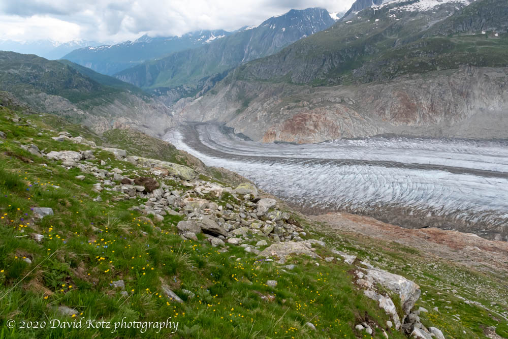 I hopped back up to the trail and was soon contouring around the corner where the hut’s tiny valley met the glacier’s massive valley.   This trail, which parallels the glacier for several kilometers, was why I was here.  As I walked, more of the glacier came into view – up the valley, where the the Grosser Aletschglacier forms by merging three glaciers descending from the valleys between Dreieckhorn, Jungfrau, Mönch, Eiger, and Fiescherhorner.