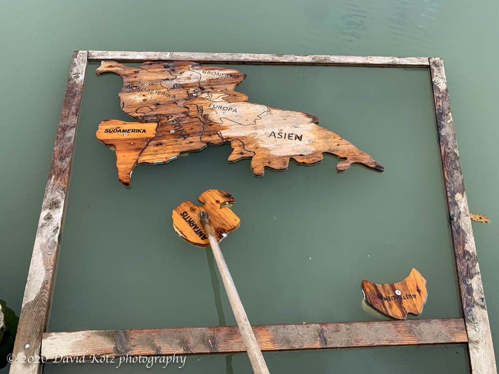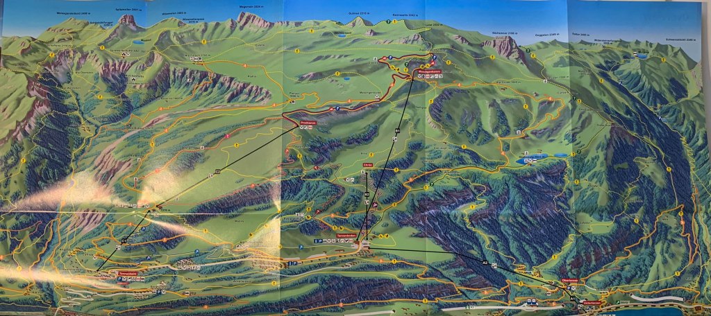 I reached Maschgenkamm, the top of the lift, in about 1h25m, better than I expected. The clouds were obscuring much of the far-side valley, sadly, but I could see it had vastly less snow-cover than it did just two weeks ago. I snapped some photos, including of some fun geology-themed activities they’ve created in recognition of this area being a UNESCO world heritage site. For example, in a tiny pond (which is invisible under the winter snows) they placed a wooden pangaea jigsaw puzzle, whose pieces you could manipulate with a magnet attached to a broomstick.