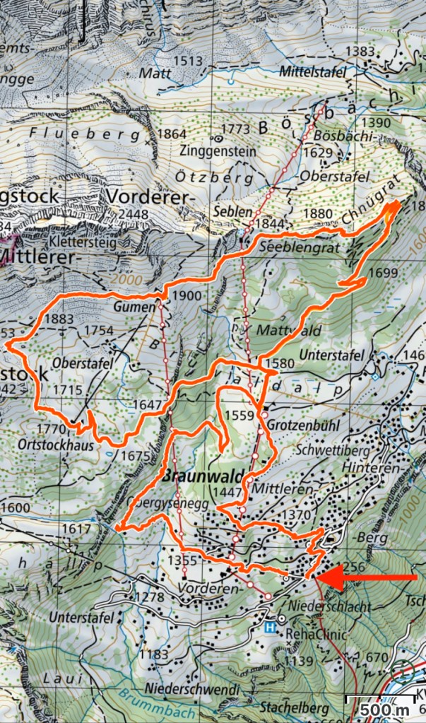 My goal today was the Braunwald Panoramaweg, a loop that begins at the Grotzenbüel gondola stop above Braunwald, climbing through forest to the top of the ridge at Chnügrat, then back along that ridge to a restaurant at Gumen, then onward across a steep scree slope and down, down, down back to the gondola. I extended the route by skipping the gondola and climbing from Braunwald. This route added another 300m of gain (and descent) but passed beside two beautiful waterfalls.
