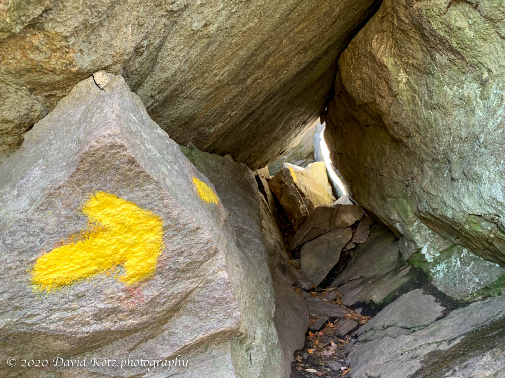 The trail sign gave me two choices to reach the summit – via the caves or via the cliffs. Well, I picked the caves of course! Little did I know that the trail would in one place make me squeeze through a passage so narrow I’d need to remove my pack, and that in another place the trail would actually cross over itself like a corkscrew. Read on and check out the gallery for more photos of Mount Morgan and Mount Percival, during fall-foliage season!