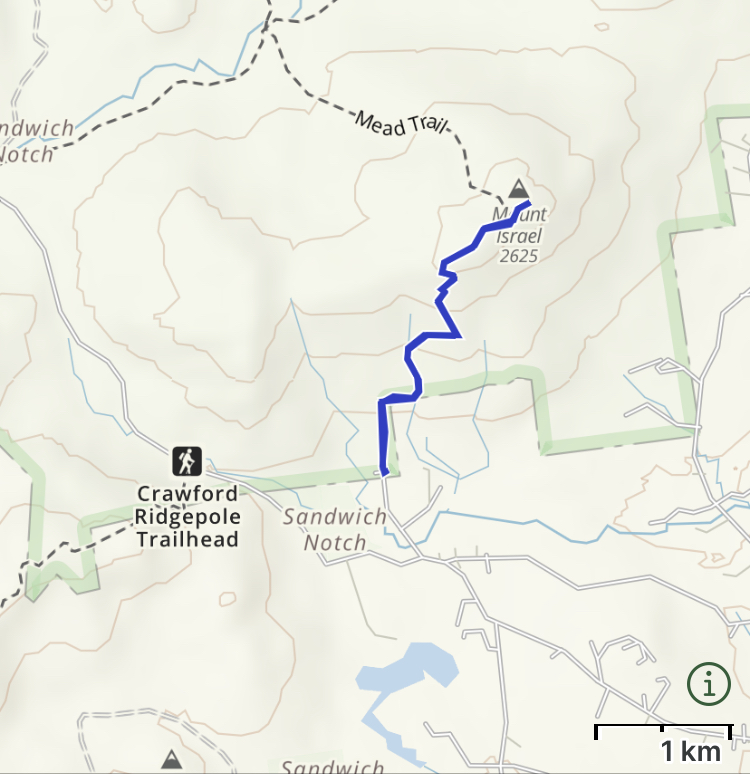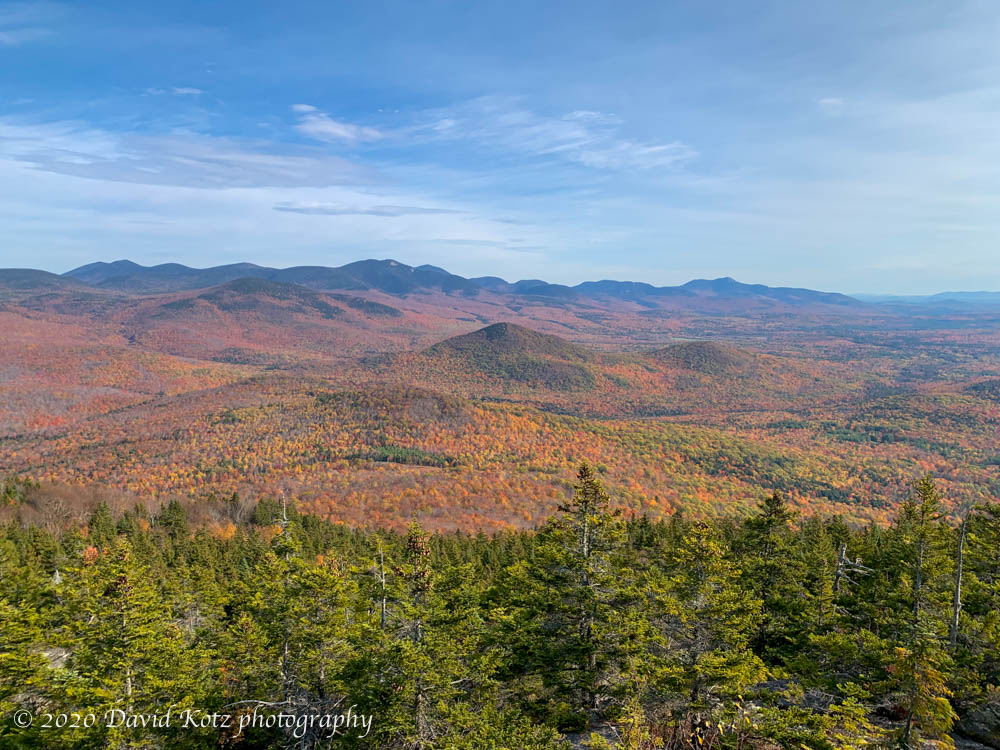 Mt. Israel has a rocky summit with outstanding views of Mount Moosilauke in the distance and Sandwich Dome in the near foreground. I had seen no other hikers on the climb up, but as I was enjoying that summit I was fortunate to encounter another man emerging from the trees beyond the summit. He pointed me to an unofficial trail that led down to an eastern-facing ledge with a spectacular view across the valley to the Sandwich Range and to the near side of Maine. I marveled at the vast, colorful valley, completely empty of roads or human habitation, right here in the center of the state. There are a few rarely-used trails in this valley, which I really should visit someday.