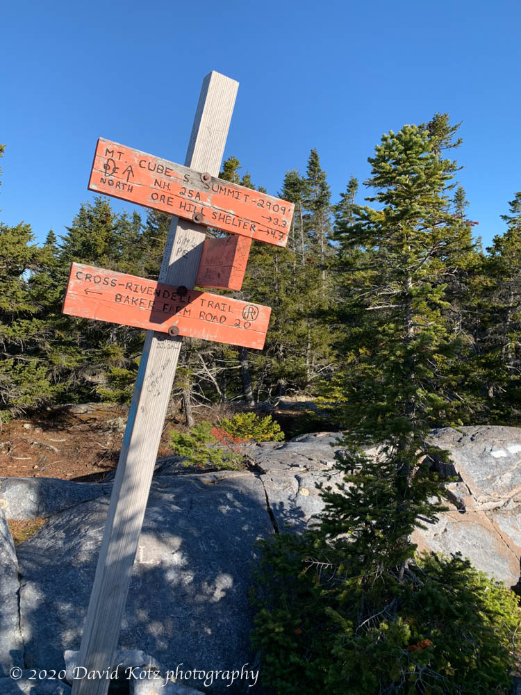 Sadly, the summit has poor views to the northeast, but if you stand on tippy-toes and peer between the firs you can pick out Mount Moosilauke. No photos worth taking, so here’s the summit trail sign, where the Appalachian Trail passes by.