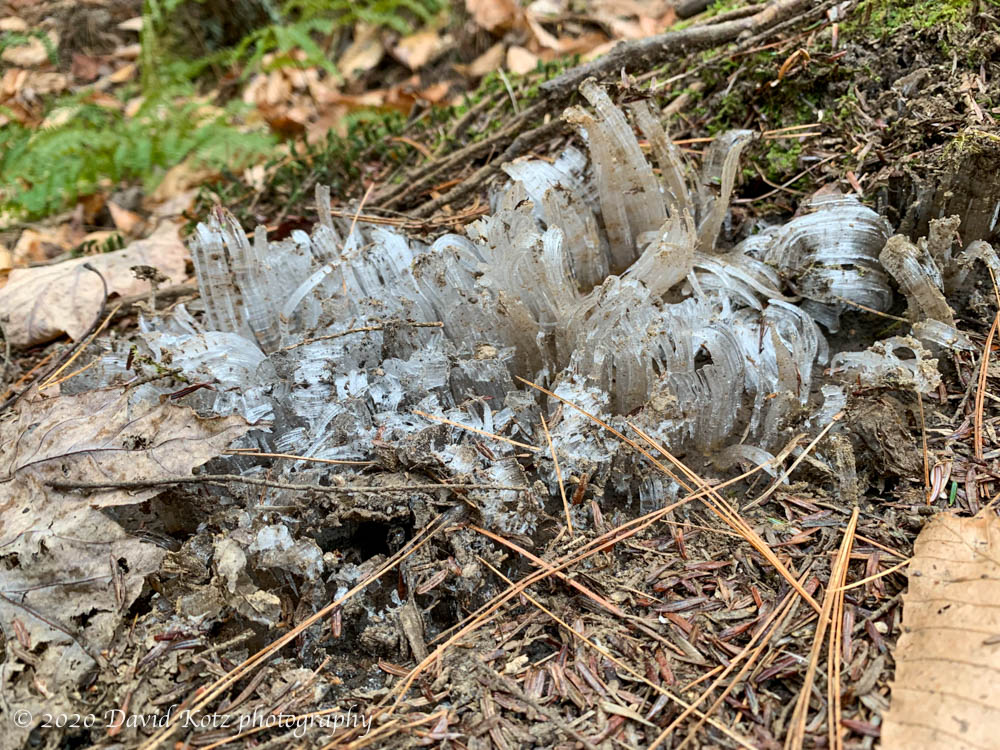For me it was a pleasant, if chilly, stroll through the quiet post-autumn forest, one that has laid down its blanket of leaves and is awaiting the big snows of winter. I enjoyed the opportunity to snap a few photos of the delightful details like the following. When mud freezes, the water expands and is pushed up through pores in the mud, leaving these fragile towers of crystalline ice. Check out the full-size photo, and three other scenes from the hike, in the photo gallery.