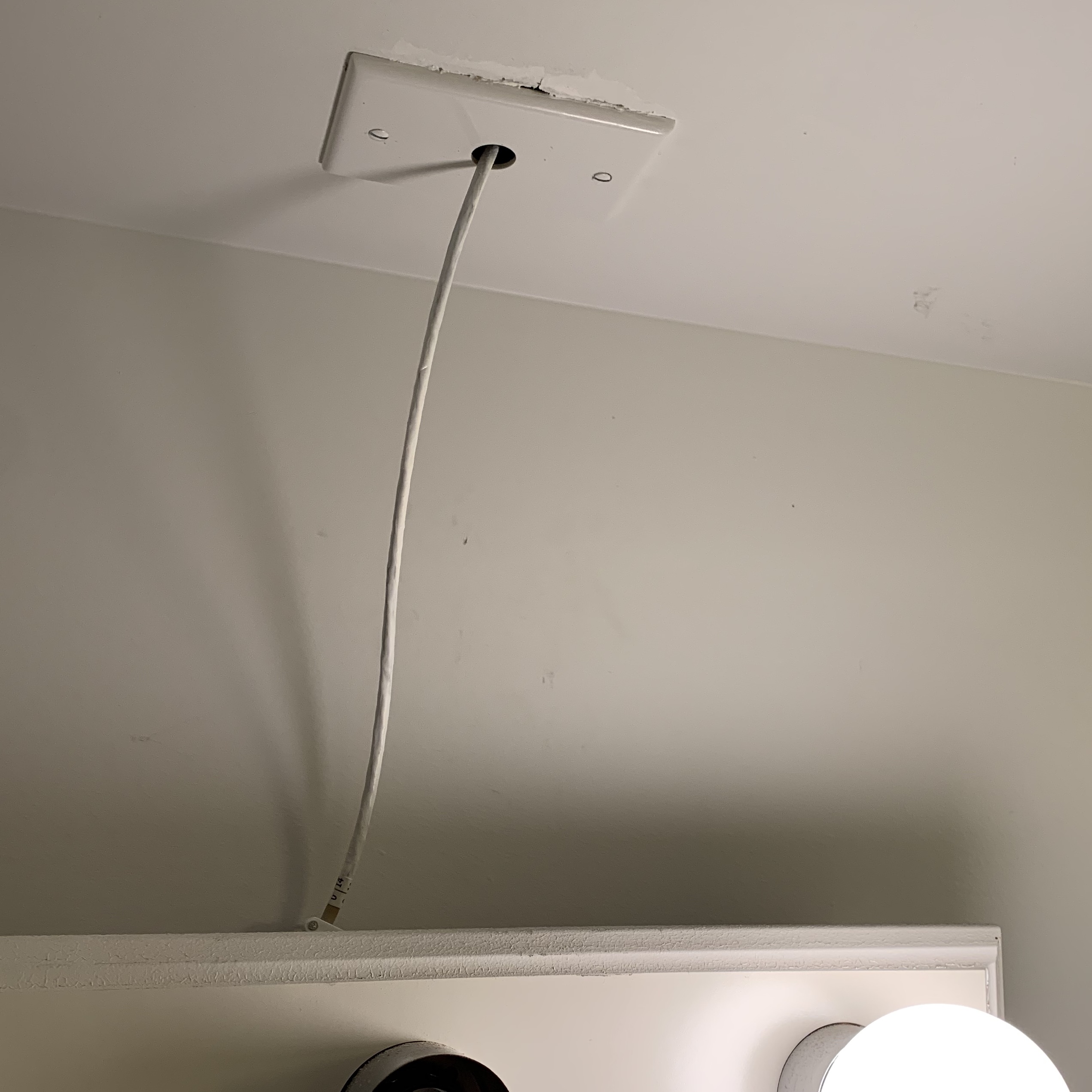 To make a long story short, after a lot of poking around I discovered a blank wall plate on the ceiling of the basement bathroom – which happened to give access to that old electric line. From there I was able to reach the exterior conduit, and from there I was able to drill some holes to pass a cable to the switchroom.