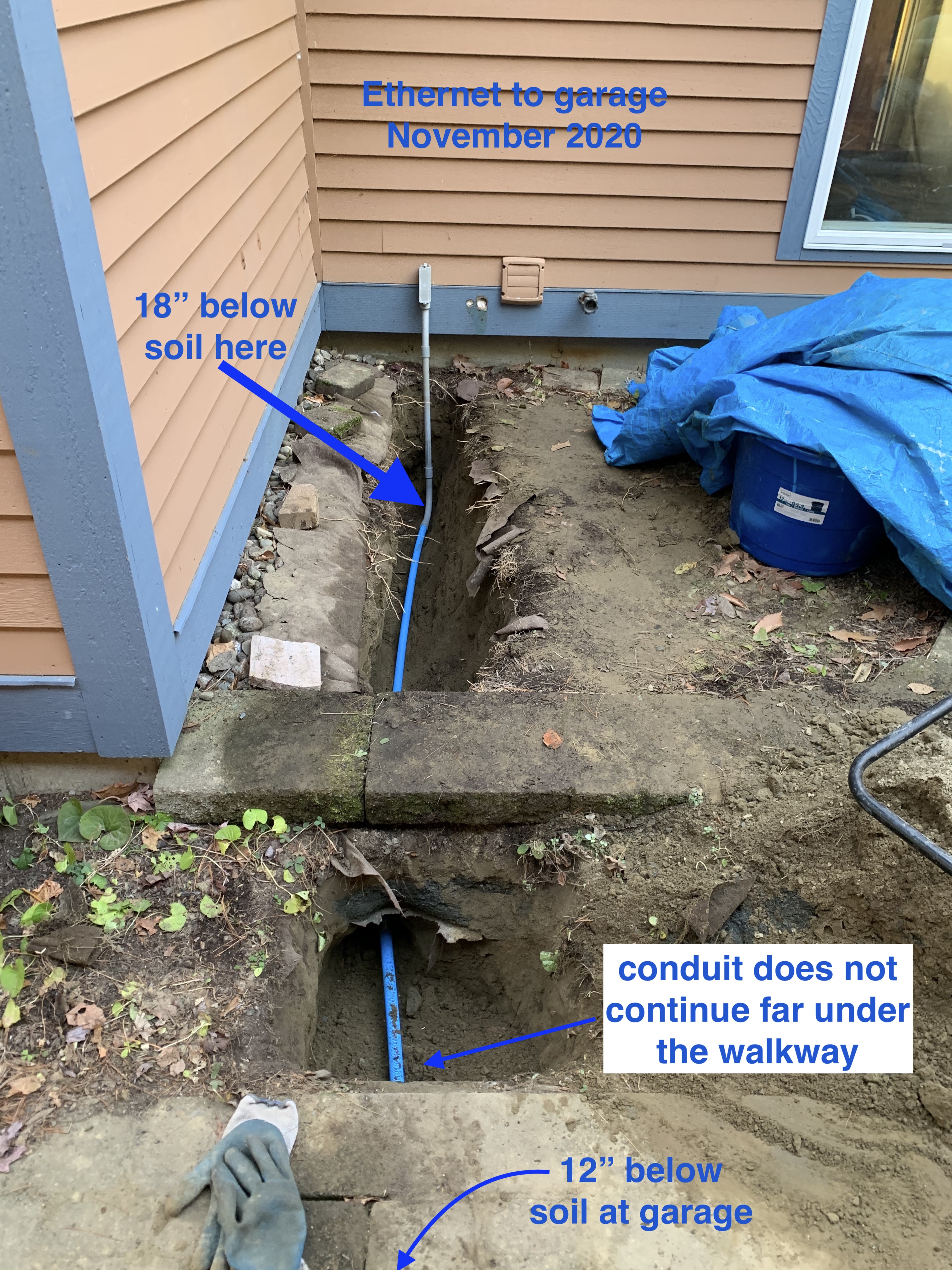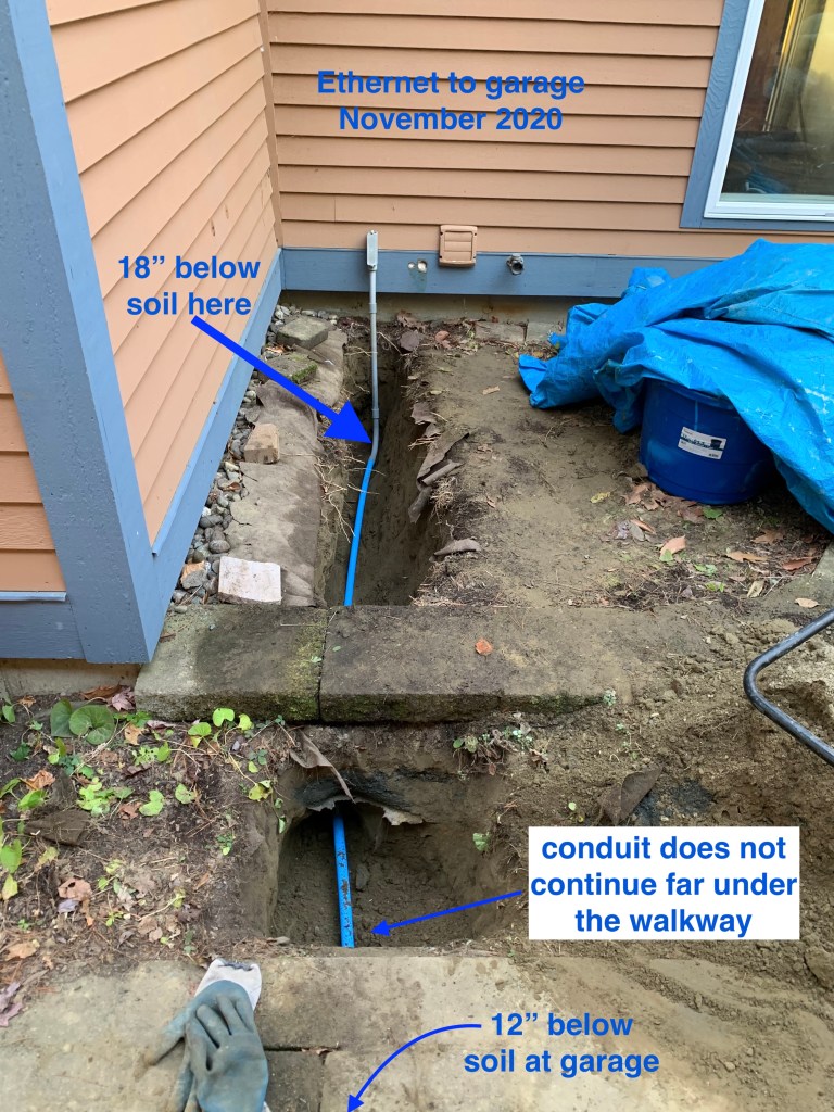 The real adventure was outside. The electric cable would not budge when I pulled at either end, so I dug a trench to find out why. It turns out the conduit ended just a few inches below the surface; the electrician just laid the naked cable in the ground. 😦 And, because it runs under a brick walkway – one we built 15 years ago with great effort – I could not dig up the whole cable and install a new conduit. With my hand, I tunneled as far as I could reach under the walk and was able to loosen the soil just enough to pull out the electric cable and pull through a new Ethernet cable. This time I installed a conduit – as far as I could – to better protect the new cable.