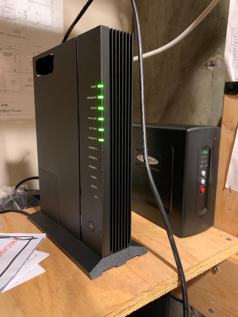 I helped him string the cable through my existing cable chase across the basement to our switchroom, where he terminated the fiber-optic cable at their (provided) Wi-Fi router. They even provide a UPS to keep the router powered during short power failures.
