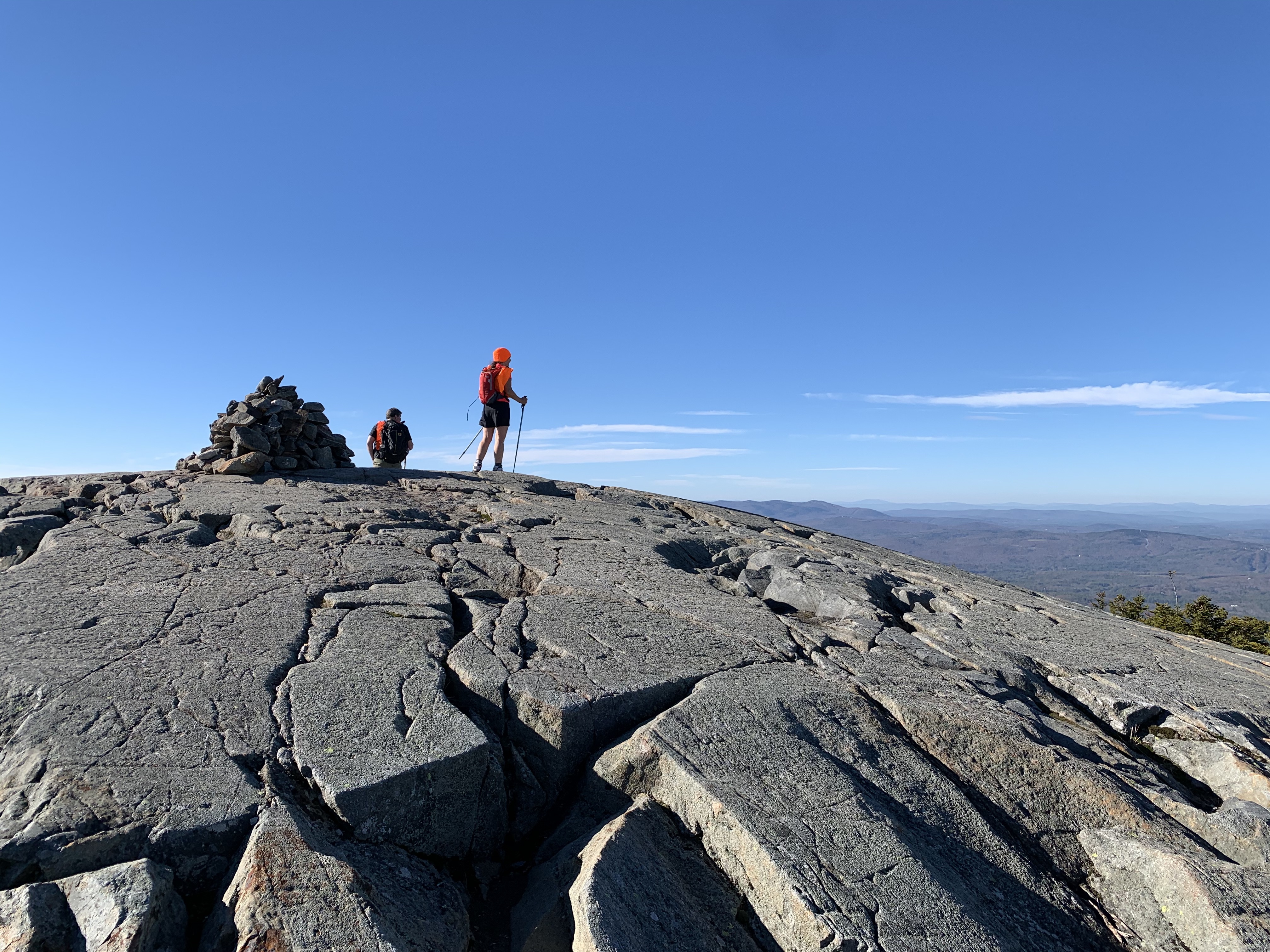 Despite a dense fog clinging to the Connecticut River in the early morning, I hopped into the Tesla for an all-electric drive to one of my favorite trailheads – the Rivendell Trail up Mount Cube, only 30 minutes away. I’ve been up this two-mile route many times, because it gives one all the features of a “real mountain climb” without the temporal overhead of a long drive or a long hike… a stroll through leafy hardwood forests, a scramble up rugged rock-strewn trails, the pungent scent of balsam firs, and distant views from its granite outcrops and 2900′ summit. In the view below, from the summit you can see the foggy Connecticut River valley in the upper right and Smarts Mountain at upper left.