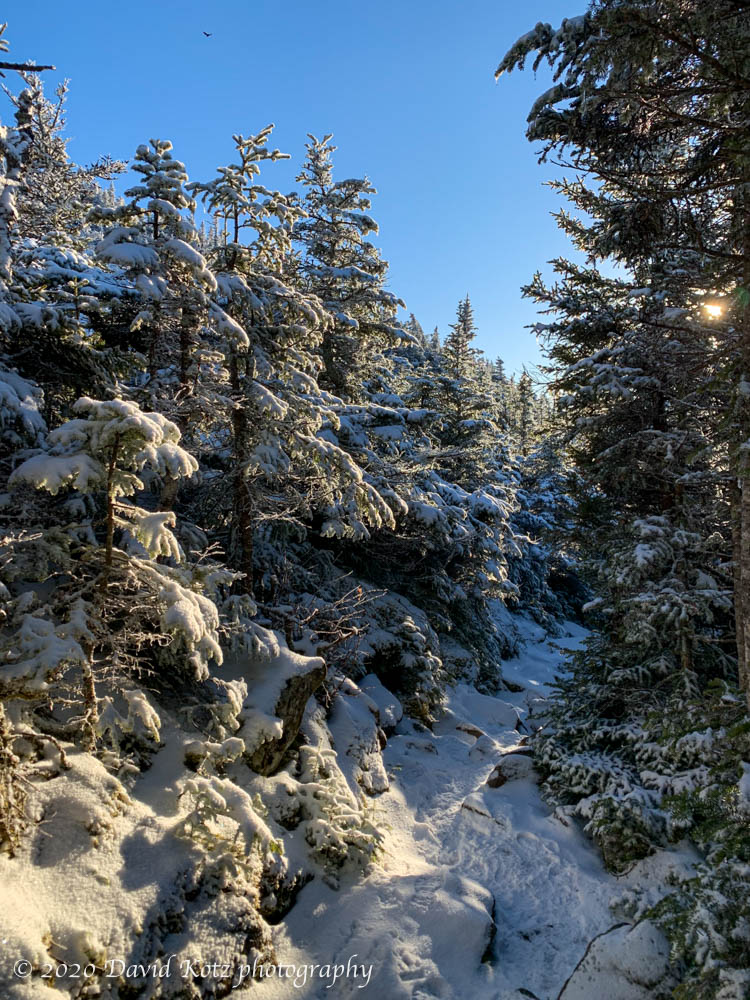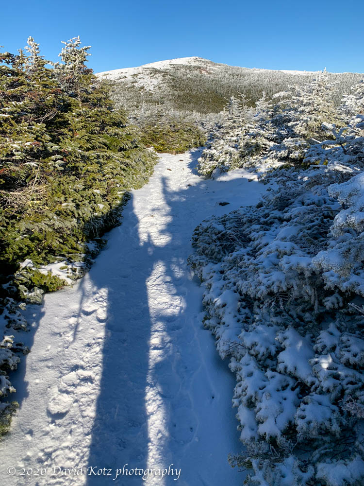 On this day, very nearly the last day of November, the forecast was for a purely sunny day with temperatures well above freezing – weather decidedly un-November-like – so I decided it was high time I went back to Moosilauke. Yesterday it rained much of the day, even at altitude, so I was concerned the Moosilauke summit may have been glazed with ice today. But I was pleasantly surprised, as I climbed the familiar Glencliff trail, to find the muddy conditions of the lower sections giving way to a dusting of snow and, higher up, nearly an inch of fresh snow on the ground and trees decorated with fresh powder and rime ice, backed by a deep blue sky. Read on, and check out the photo gallery.