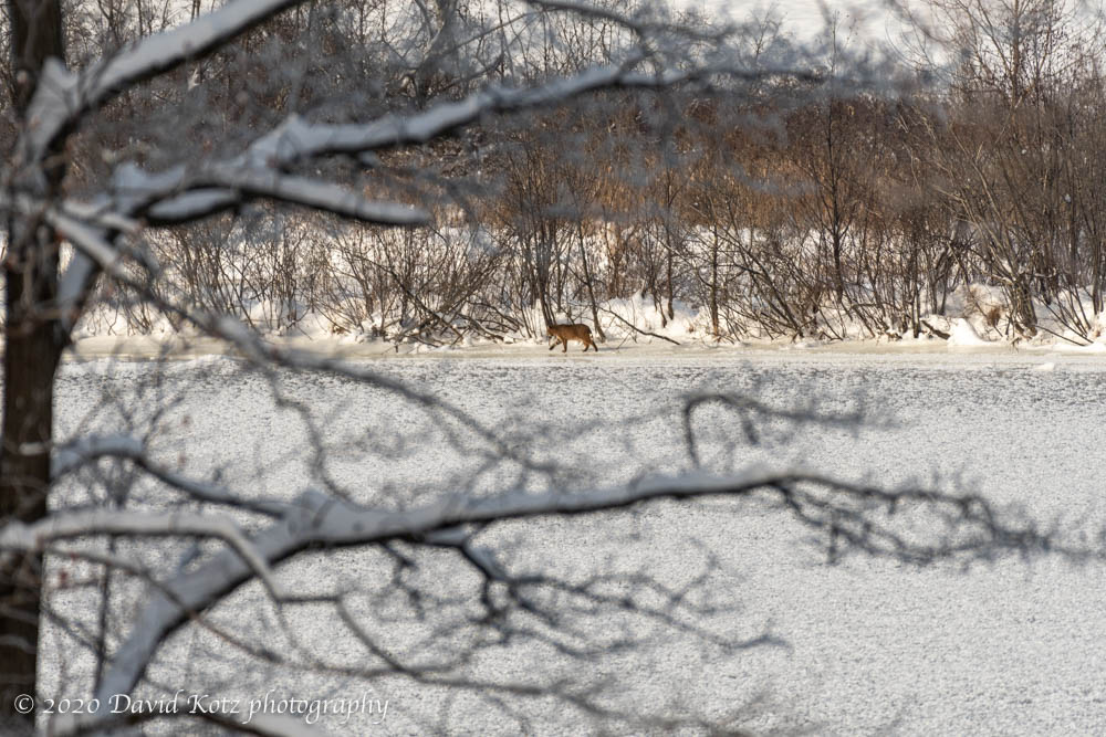Today, however, I had the good luck to look out the window, across the snowy lawn and the icy river to a dark figure moving along the Vermont shore. A bobcat was exploring the river’s edge, as if to test the ice and consider a move to New Hampshire. I grabbed my Nikon and the 200-500mm lens and collected a couple hundred shots in the two minutes it took him to walk out of sight. Even at 500mm it still takes a tight crop to get a good look, below. See the gallery for a few more, including a nice look at his face while he pauses to drink from the river’s surface.