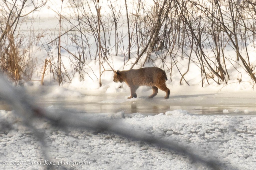 [uncropped] A Vermont bobcat explores the river shore across from our house.