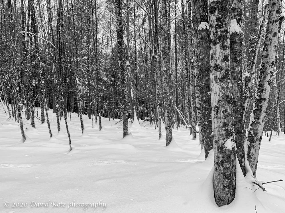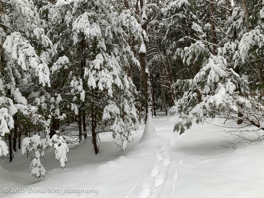 I mostly visit here in winter, on snowshoes or skis, traversing above the litter of the forest floor and pondering the many tracks animals leave behind. Deer tracks are never out of sight; mouse and squirrel tracks are common; bear and fox are an occasional treat. There were plenty of deer tracks criss-crossing my path today, as my snowshoes waded through the fresh powder laid down by that storm two days ago. I happened to look up at the right moment to see a huge owl gliding through the treetops ahead of me, totally soundless in this quiet snowscape. Someday I hope to have a chance to photograph these elusive neighbors.