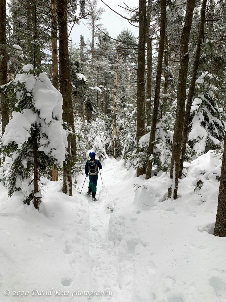 The snowstorm five days ago brought us a sudden beginning for winter, laying down deep powder across the mountains and trails. I’ve been out every day to enjoy the snow, prime conditions for skiing and snowshoeing. With bad weather looming for tomorrow and the next day (Christmas Eve and Christmas Day), Andy and I set out today to make the most of the snow before the rain spoils it.