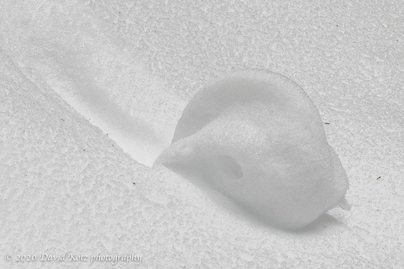 You can see the track it made as it rolled down the hill from left to right. This roller is not particularly impressive, about 8-10″ in diameter and somewhat melted from today’s warm temperatures. Below is a tight crop: