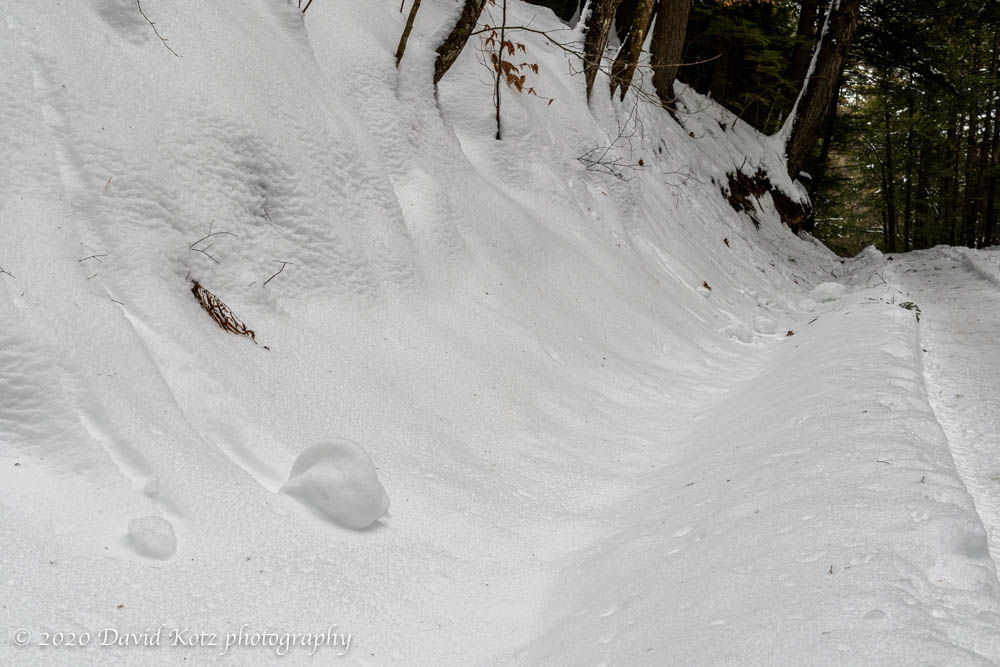 Recent snow conditions appear to have been ideal for the creation of snow rollers, an extremely cool (but uncommon) phenomenon. I’ve only seen them once before. Yesterday, Andy and I drove past a roadside hill south of Windsor, VT that was decorated with literally hundreds of small snow rollers – a most impressive collection! Unfortunately, that stretch of VT Rt.44 has no safe place to stop, so we were unable to photograph any of those rollers.